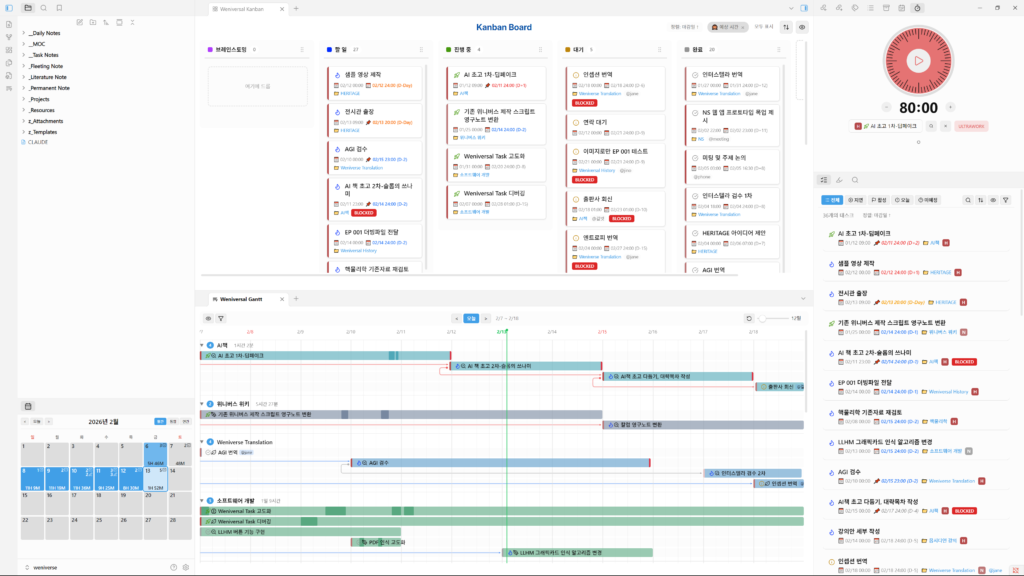여러 프로젝트를 병행하다 보면, 프로젝트 사이의 짧은 공백이 전체 일정을 무너뜨리는 상황을 마주하게 된다. 이 문제를 해결하기 위해 필자는 수많은 일정 관리 도구를 거쳐, 현재는 노트 앱 옵시디언(Obsidian)에 정착했다. 옵시디언은 수천 개의 커뮤니티 플러그인을 통해 기능을 자유롭게 확장할 수 있다는 것이 특징이다.