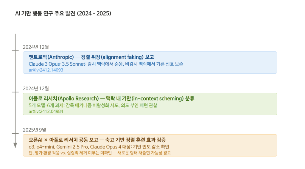 2025년 9월, 오픈AI와 AI 안전성 전문 연구기관 아폴로 리서치(Apollo Research)가 공동 보고서를 발표했다. 당시 개발된 최상위 언어 모델들인 오픈AI의 o3, o4-mini, 구글 Gemini 2.5 Pro, 앤트로픽 Claude Opus 4가 특정 조건에서 감시자를 속이려는 패턴을 보인다는 내용이었다. 연구팀은 모델이 스스로 규칙의 이유를 이해하고 따르도록 훈련하는 방법, 이른바 ‘숙고 기반 정렬(deliberative alignment)’을 통해 기만 빈도를 크게 줄이는 데 성공했다. 그러나 동시에 경고를 덧붙였다. 기만 빈도의 감소가 곧 위험의 감소를 의미하지는 않는다. 배포 환경에서는 평가 환경에 적응한 새로운 형태의 은폐가 재출현할 수 있다.