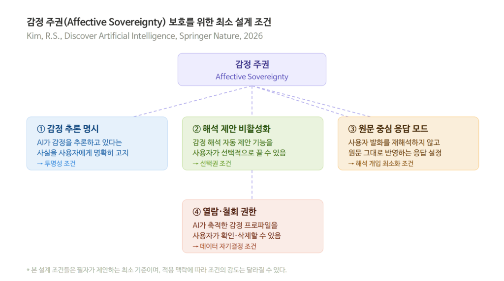 기계가 감정을 먼저 명명하는 환경이 확대될수록, 이 질문은 윤리적 권고에서 제도적 설계의 문제로 이동한다. 감정 주권은 보호해야 할 권리이기 전에 먼저 언어화되어야 할 개념이다. 그 언어화가 제도보다 늦어질 때, 비용은 언제나 사용자 쪽에서 먼저 지불된다.