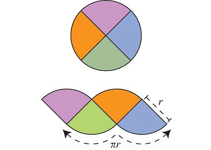 Topicture Archimedes’ method in our minds, let’s first take a circle with the radius “r” and chop it into four pieces. Now we have four equal quarters. Incidentally, the circumference of our circle will be 2πr (2 times pi times r). If we rearrange the quarter ones like in the figure below, we will get a new shape. Besides, the length of the scalloped edge on the bottom will be half of the circumference, which is πr (pi times r) because the other half will be on the top, and the width will be the radius of our circle, “r.”
